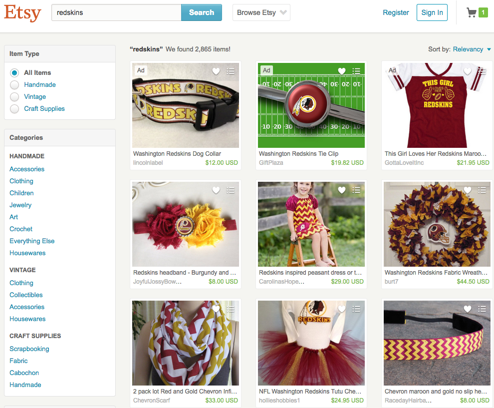 Redskins fans looking for men’s thongs, bedazzled caps or Tom’s decked out with Swarovski crystals will won’t be able to find them at Etsy, the online marketplace for vintage and homemade goods. In the past, you could find all kinds of kitsch bearing the logo or name including t-shirts, shoes, baby onesies, wedding cake toppers, wreaths, dog collars and more.