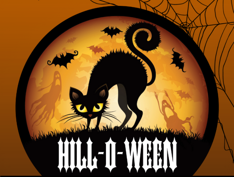 A black cat in a circle on an orange background with bats flying overhead and the word Hill-O-Ween underneath. (Graphic: Captiol Hill BID)