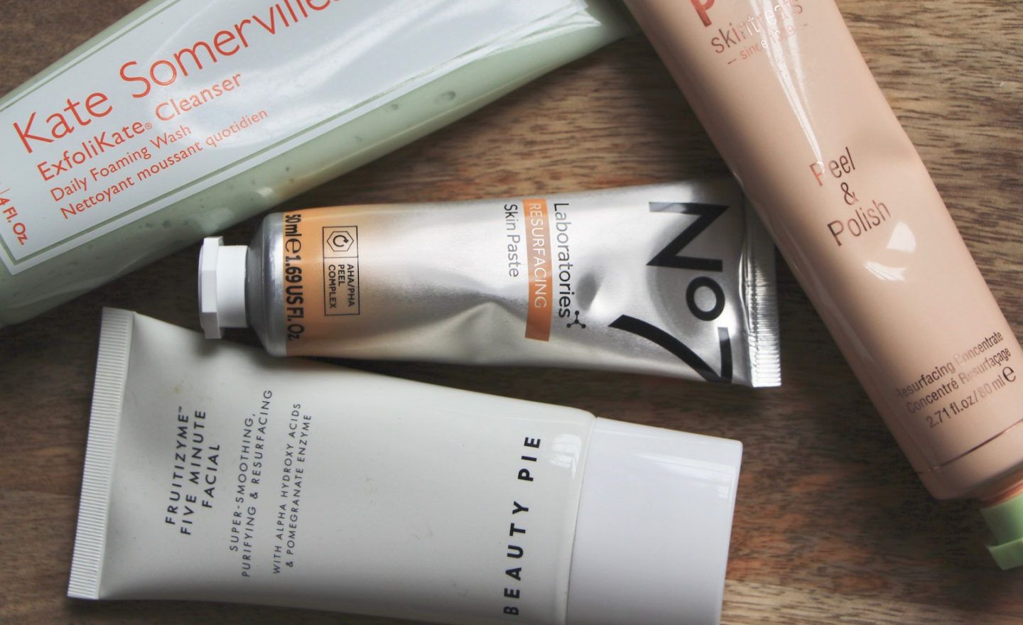 AHA, alpha hydroxy acids, Beauty Pie, brightness, daily foaming wash, exfoliating, ExfoliKate Cleanser, face mask, fruit enzymes, Fruitizyme Five Minute Facial, glycolic acid, Kate Somerville, lactic acid, No7 Laboratories, Peel & Polish, PHA, Pixi, Resurfacing Skin Paste, retinol, skin-resurfacing, skincare, smoothness
